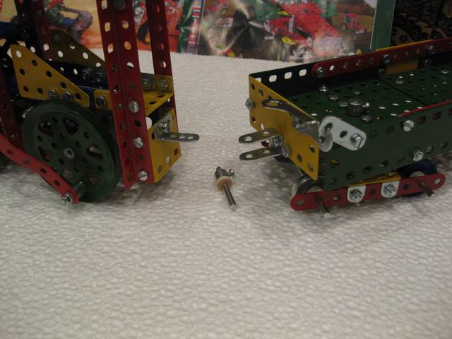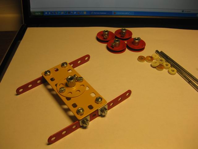 Модель железной дороги из детского металлического конструктора.описание Пример постройки действующей модели железной дороги из металлического конструктора с размером колеи 50 мм. В базовых инструкциях к конструкторам Меркур есть варианты моделей поездов, но все они, к сожалению, не действующие. В этом примере паровоз ездит, у вагона опускается борт, а каждая тележка вагона имеет 2 колесных пары и закреплены они как у настоящих вагонов, за концы оси. Для полноты комплекта модели железной дороги и проведения испытаний поезда не забыли сделать и уложить рельсы на шпалы и оборудовать их тупиком.Для привода используется стандартный электродвигатель с редуктором из детских наборов Merkur.Паровоз.